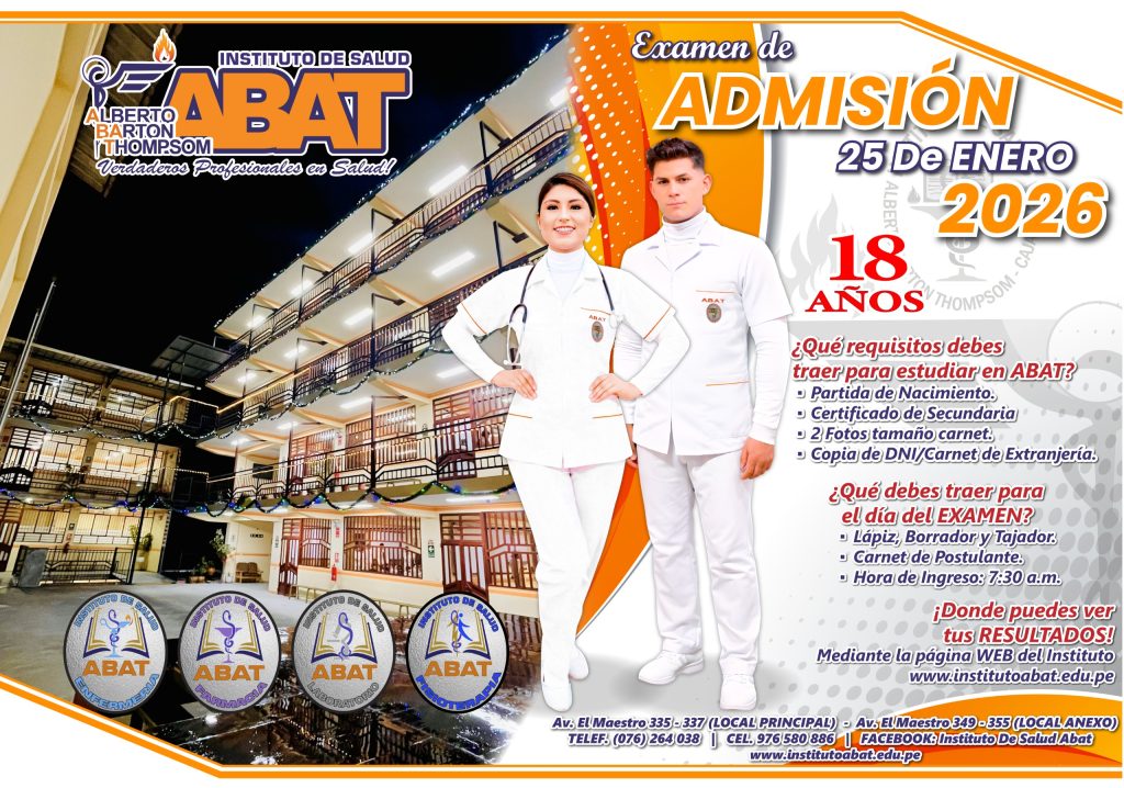 El Instituto de Educación Superior Tecnológico Privado de Salud «Alberto Barton Thompsom» (ABAT), a través de su Oficina Central de Admisión (OCA), anuncia que su Examen de Admisión General 2026 se realizará de forma presencial el día 25 de Enero del año en curso. REQUISITOS: Partida de Nacimiento Original. Copia de DNI ambos lados. Certificados […]
